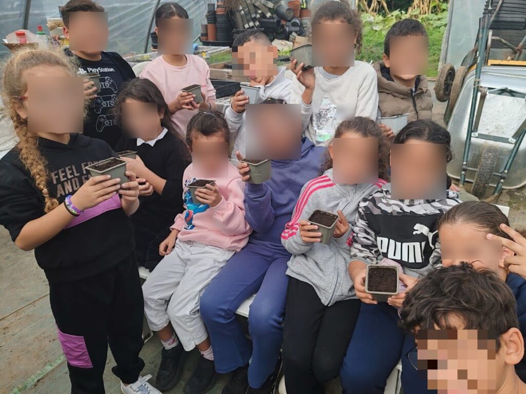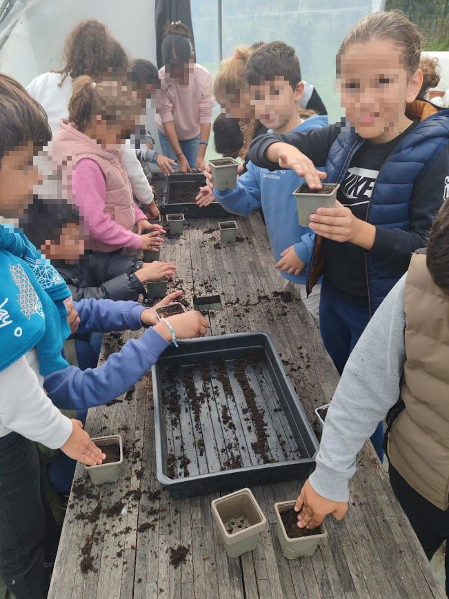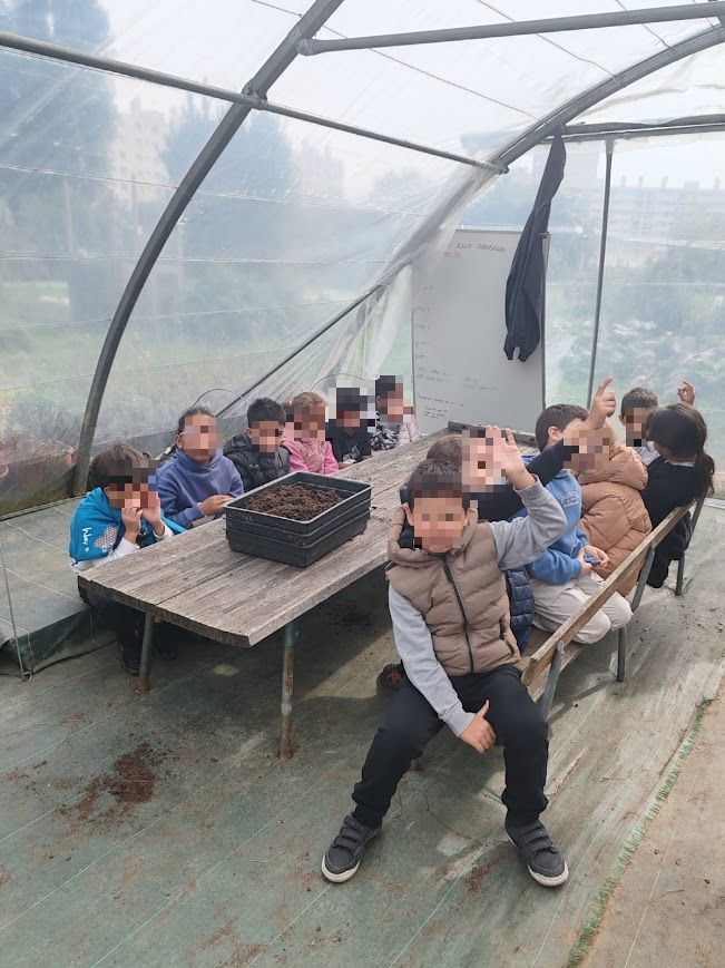 Accompagnés de leur enseignante, Mme Cantone, les enfants ont été accueillis par l’équipe du jardin qui leur a présenté les différentes cultures et les espaces dédiés à la nature. La visite a commencé par la découverte de la serre, où les élèves ont pu observer les semis, comprendre comment les jeunes pousses grandissent et à quelles conditions elles se développent le mieux.